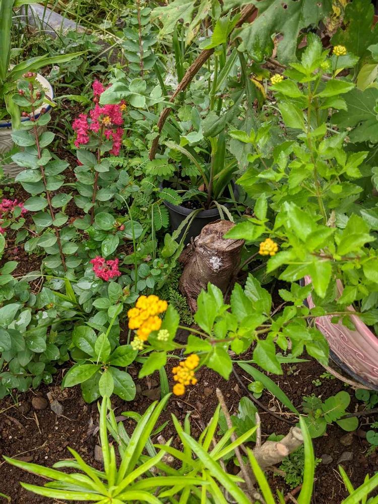 サルスベリ。ランタナ黄色。ランタナ黄色が咲いたのは、今日気が付きました。前に挿し木をしていたんですね!花が咲いて。色がわかりました。🤣☺️🤗