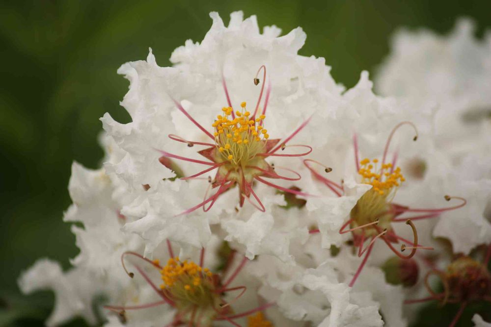 白いサルスベリは、蕊の黄色や花柄の赤色が鮮やかに見えます🤍💛❤️