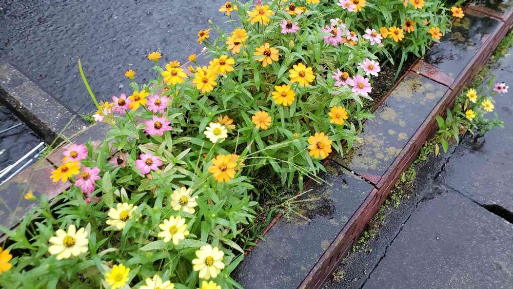 雨に打たれて咲くジニア。仲良くおしゃべりしているみたい。