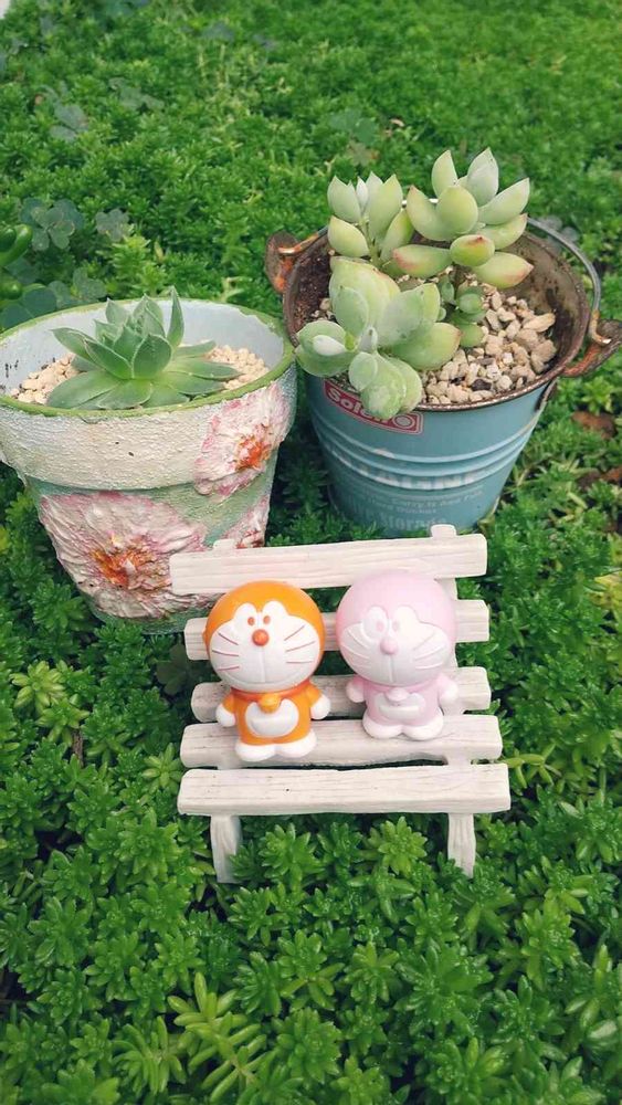 PIROちゃんのセダムの森は、いつもグリーン💚が美しい‼️ドラえもんがベンチで一休みしてるんや😍可愛いよ