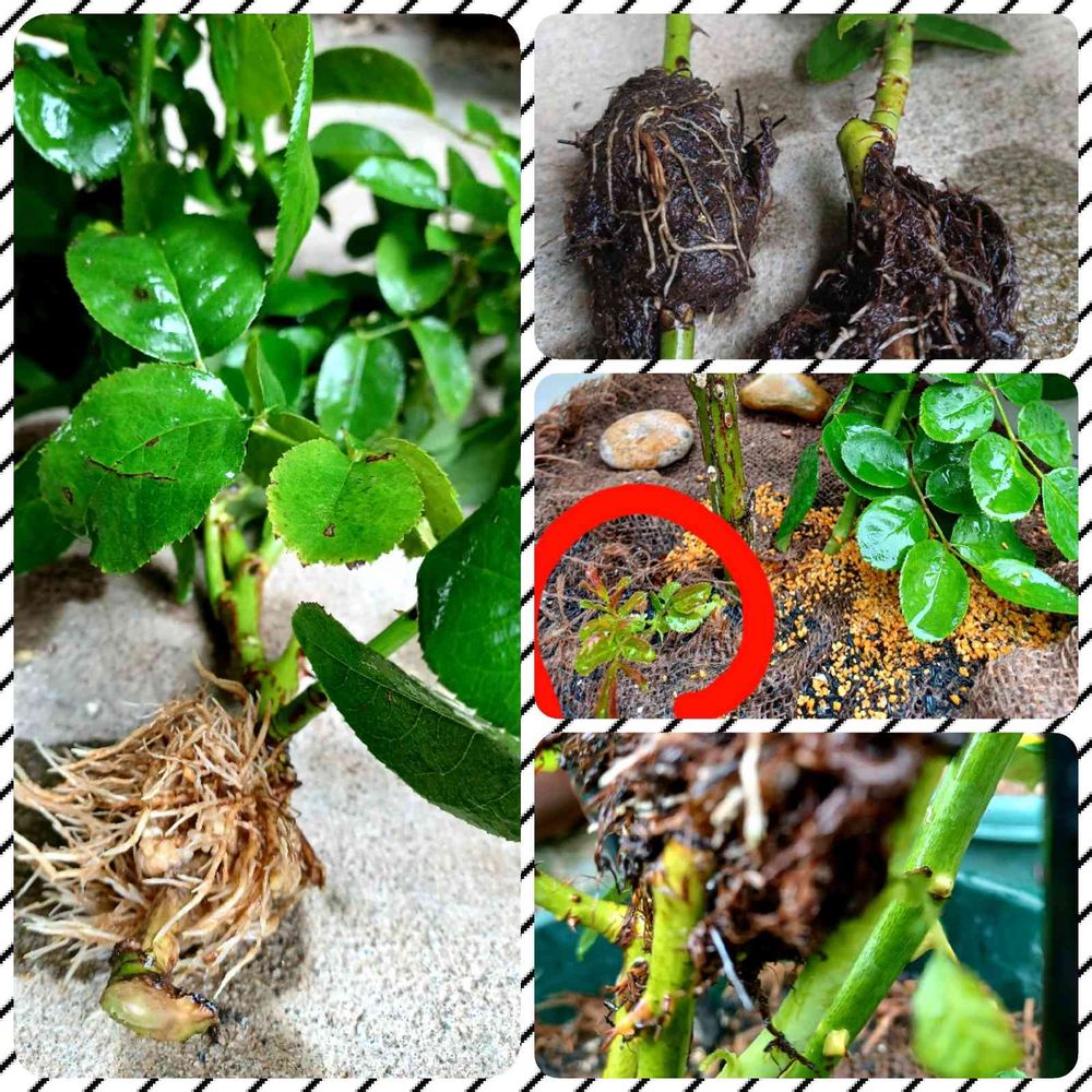 今晩は✨…お疲れ様でした~😊先月の1日に取り木をはじめ~…枝の大きさなりの根の量まで増やしたかったですが他の🌹を剪定したので取り木の枝も✂️しました🌹雨が多かったせいか3本とも発根していました🙌ついでに、各取り木の枝の横にシュートも↗️↗️↗️