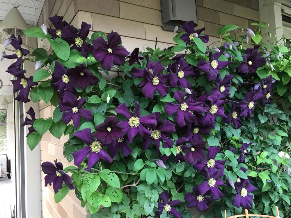 我が家の古参のクレマチスです。濃紺の色と花弁の先が特徴です。こちらはベランダで、親株から挿木したものです。