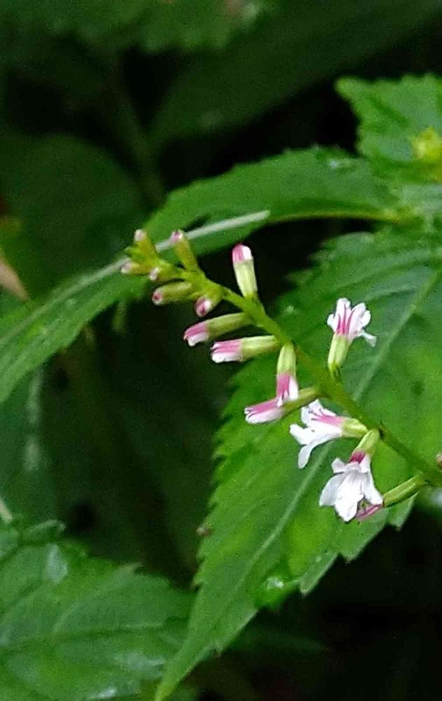 山道の日陰で直立した枝にまばらに5ミリ位の白い小さな花を咲かせています🌸