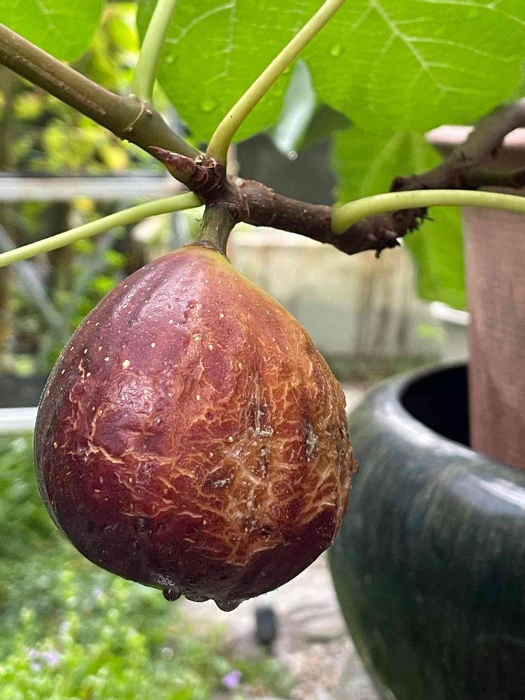 無花果がなりました。食べ頃かな。狭い庭なので鉢植え。蟻に襲われないよう、薄く水を張った鉢に植木鉢を入れています。
