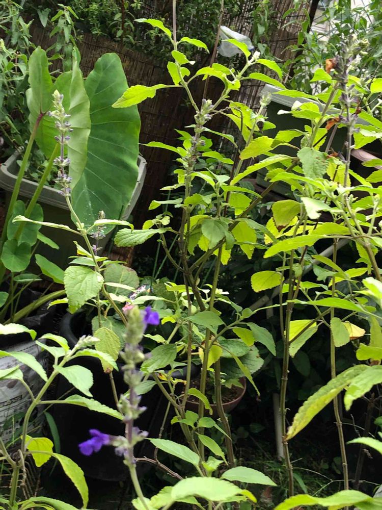 令和3年9月4日(土)曇り☁️ ^_^ おはよーございます 小さい庭で朝の見廻りしています。 すっかり秋の気温の庭でスーパーサルビア ロックンロールディープパープルの新しい蕾みが開花準備を始めています。2月🌱芽の出た里芋はソロソロ?収穫期が?黄色くなった葉は取り除いていますが成長とまったかな?🧐