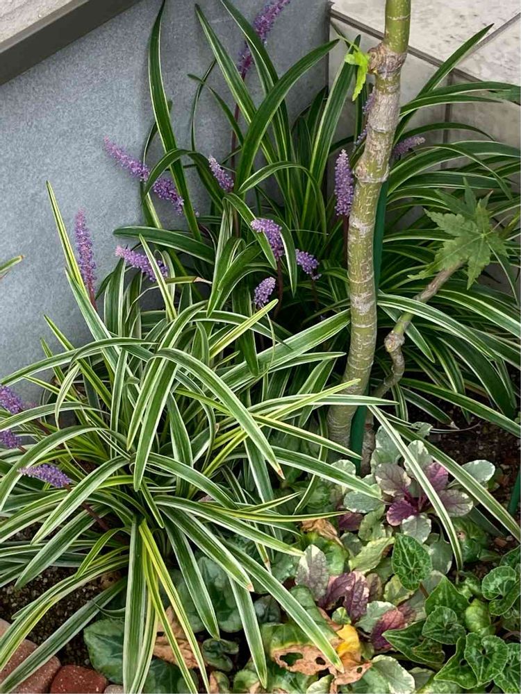 斑入りヤブラン(フイリヤブラン、リリオペ)です。和式の庭でよく見ますが 最近洋式の家でも植えられ 壺庭って感じでいいですね。