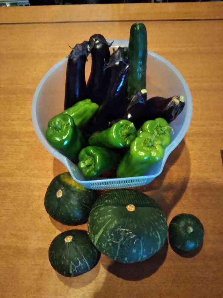 朝の収穫(👴👵カボチャは三日前)ピーマン六個茄子八本位きゅうり三本ミニトマト下に十五個位充分です☺️