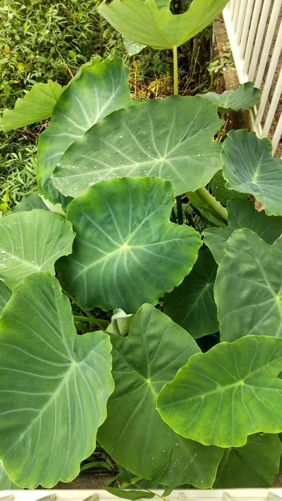 畑の隅っこの、落ち葉や草を捨ててる場所に自生えして立派に成長している里芋の葉っぱです💚