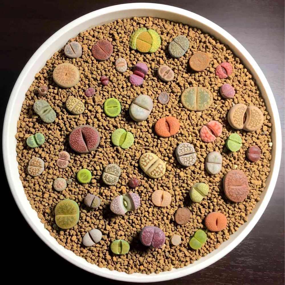 これは植え替え足していったものです💡でも今はこの写真よりも脱皮が進んでいて、普通は脱皮したら中からひとまわり小さなリトープスに生まれ変わるんですけど、2頭に分かれているものもありますよ😊すごく小さい子は種から育てたやつです💡根が長くまっすぐ伸びるので今後植え替える時は高さが10〜15cmあると安心ですね☀️