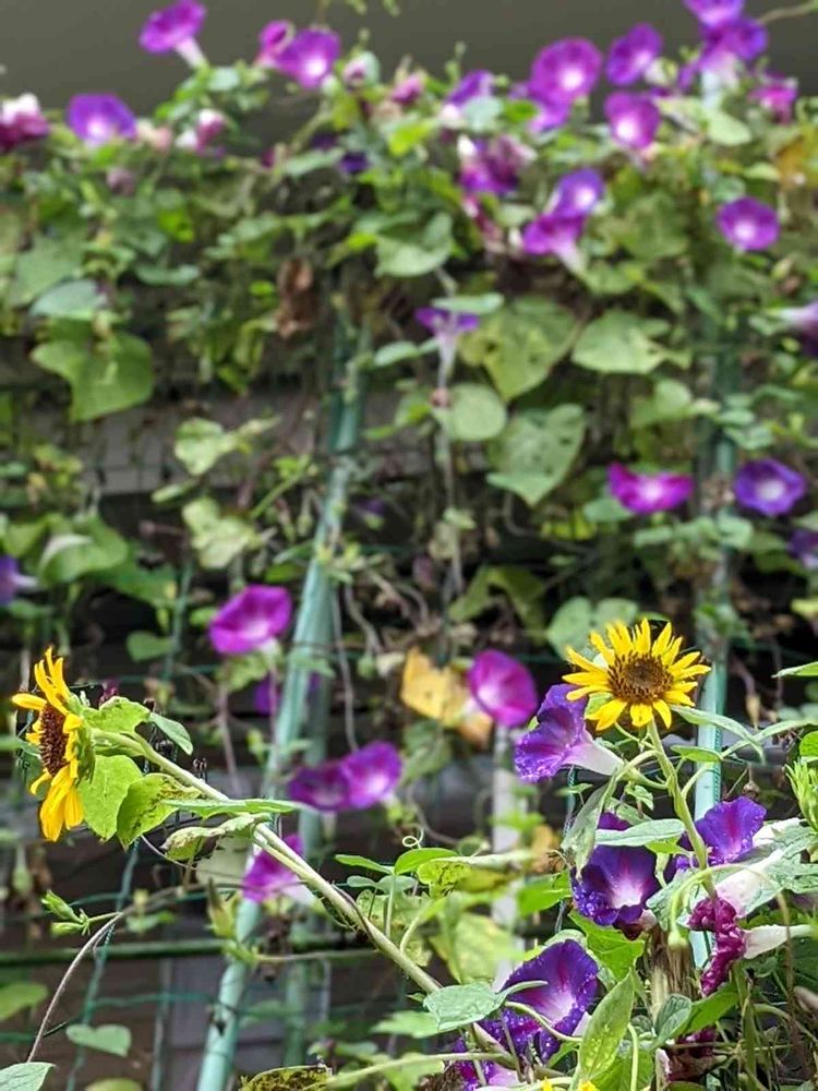 お天気は雨が続きますがまだまだひまわりも朝顔も元気元気 ♪