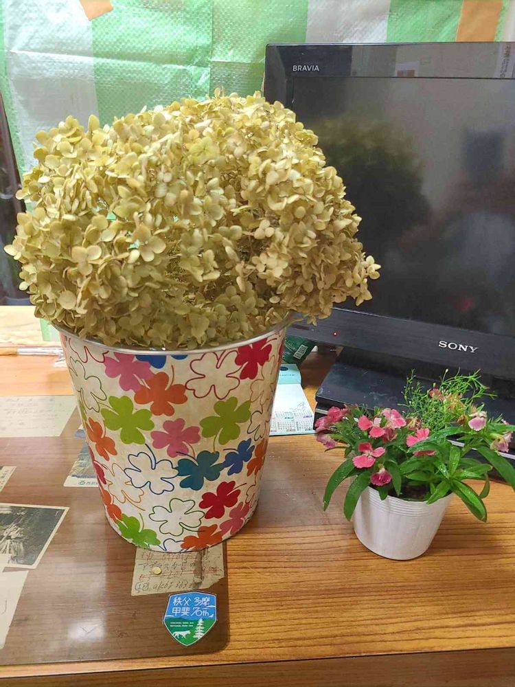 咲き進んだアナベルを花瓶に挿して置いたら綺麗なドライフラワーになっていました😊