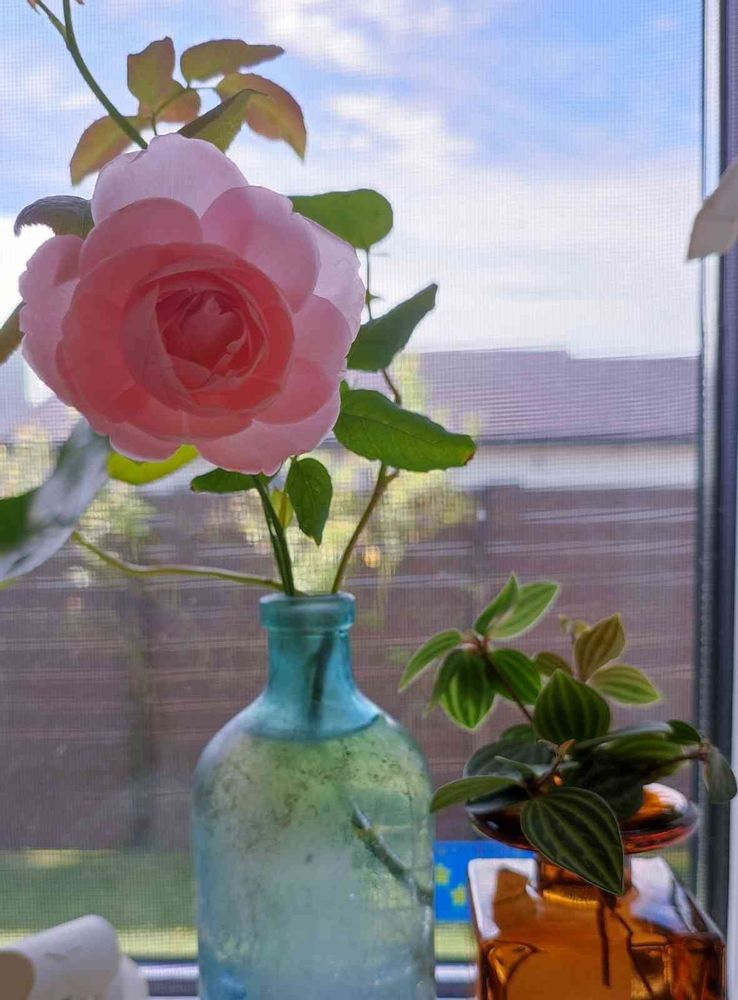 剪定後のナエマを汚いアンティークのソーダボトルに。薄いブルーが好き。