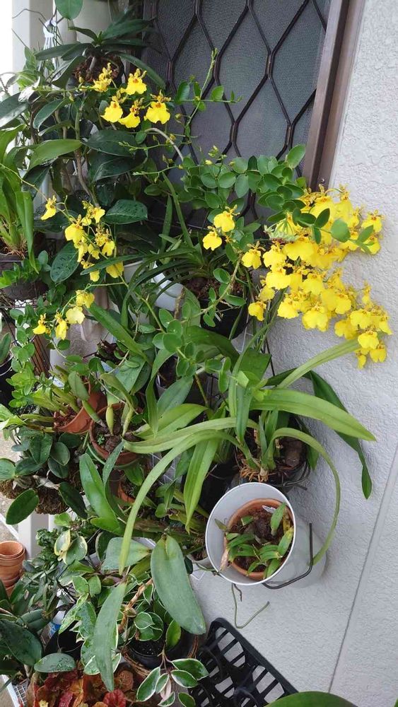 風呂場の窓からこんにちは。500円でいただいたオンシジウムは絶好調です。
