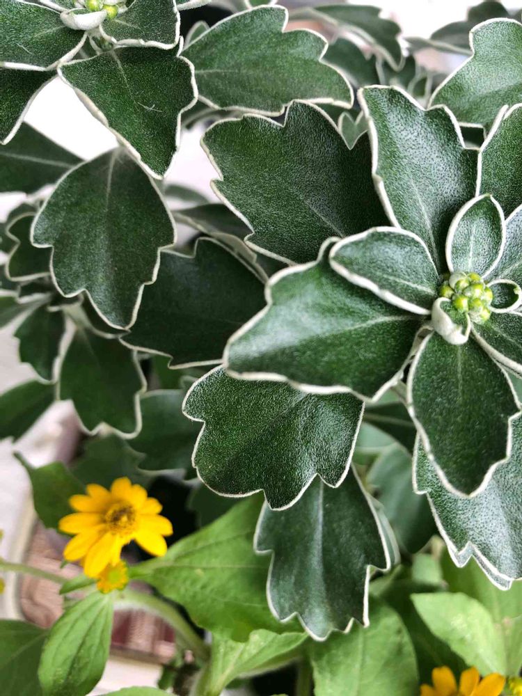2021-9-5(日)曇り☁️ イソギクの葉の裏側が表に反り👀 見た目が白い縁取りの葉っぱみたいで これから菊の季節になって🌼花が着くけど今の状態でも満足💕🥰思えばシロタエギクも葉に惹かれたな……