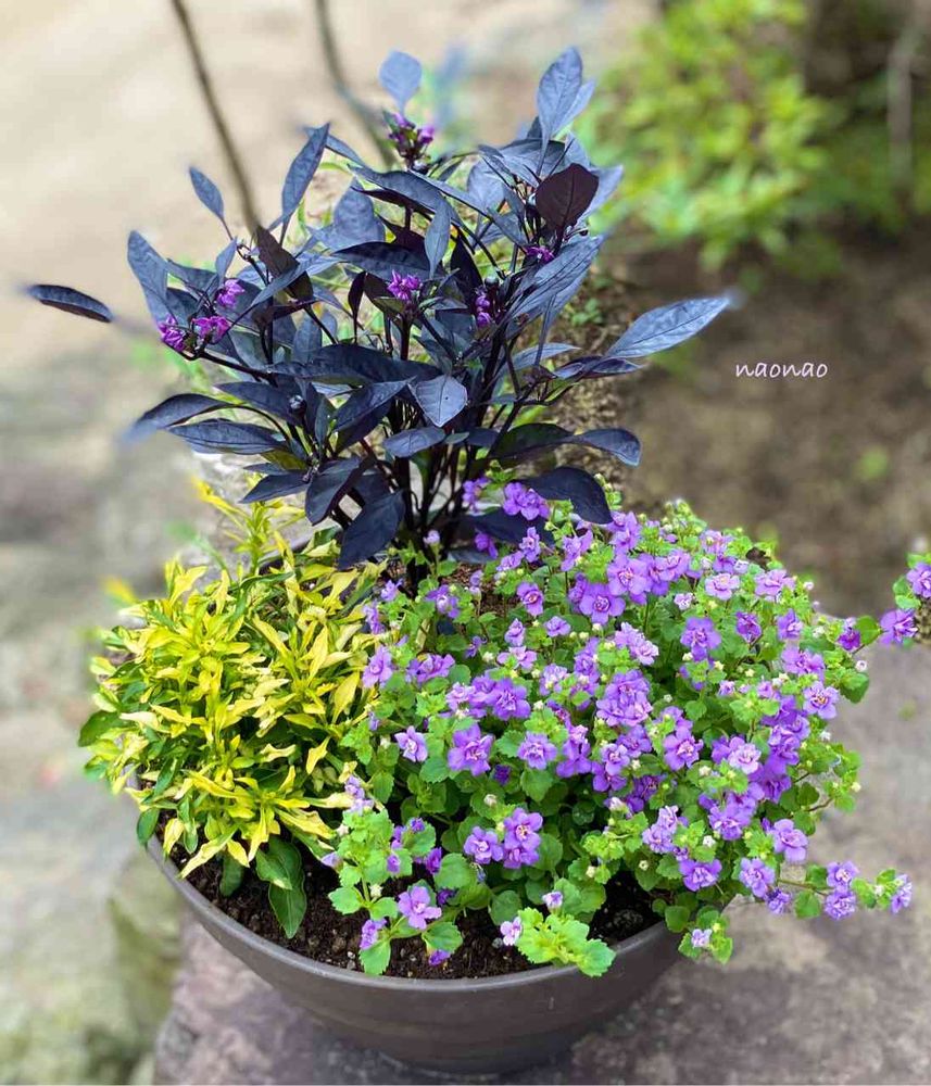 いつも行く道の駅のお花コーナーに、渋い銅葉の観賞用トウガラシがあったので、それに合わせて、渋めの秋っぽい寄植えにしてみました💜