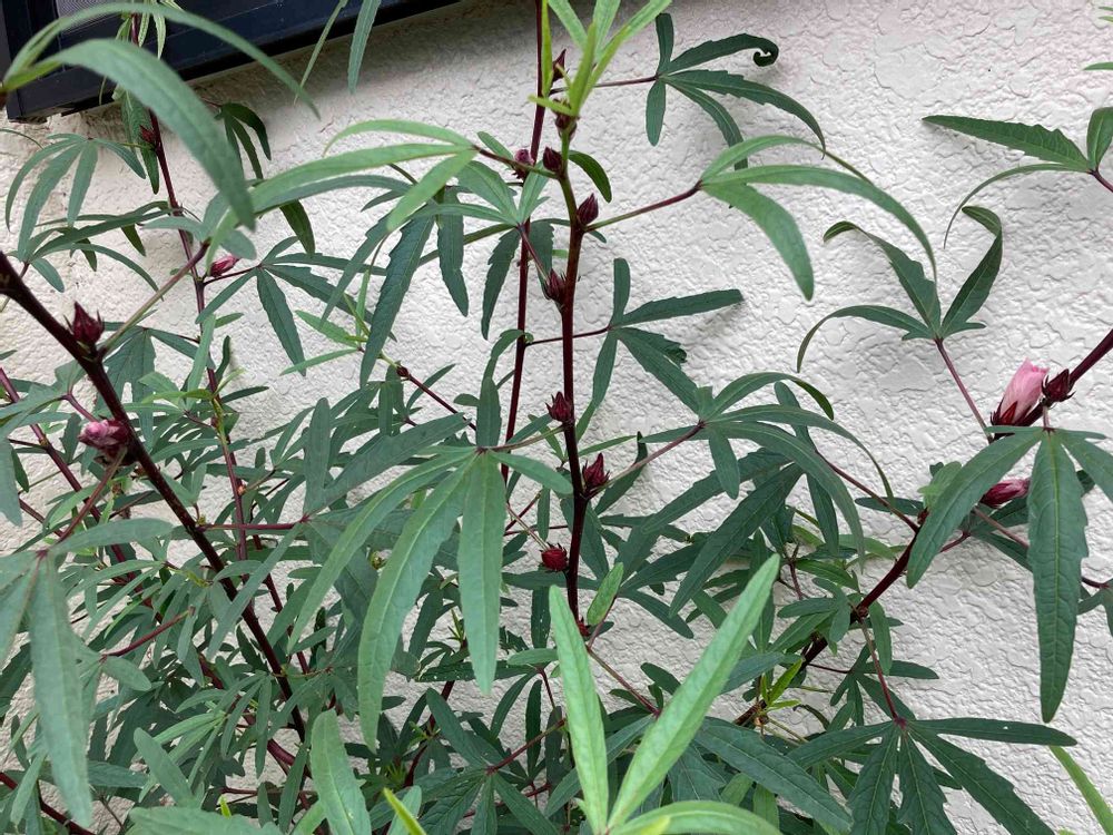 長らく蕾だけだったローゼル、一切に咲き始めた!でも、曇りと雨続きのせいか開き切らない。