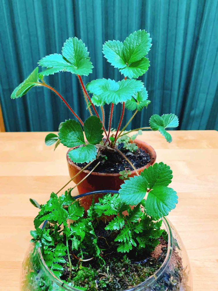 ガーデンストロベリー(奥)の葉が元気です。室内で育てているので、受粉が難しいですけど、花が咲いたら外においてみようかな🍓
