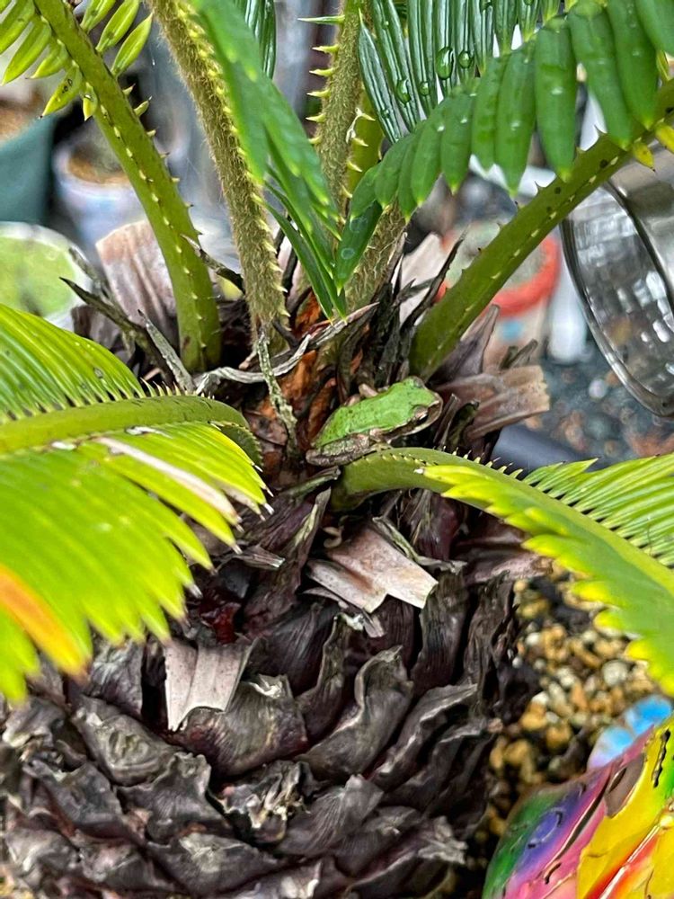 ソテツに新しい葉が生え出している中可愛いカエルが休憩してた😍