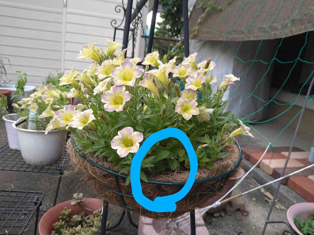 壁掛けハンギングバスケットのとらネコちゃん。もりもりになってきたと思ったら、手前に紫の蕾を見つけました!!
