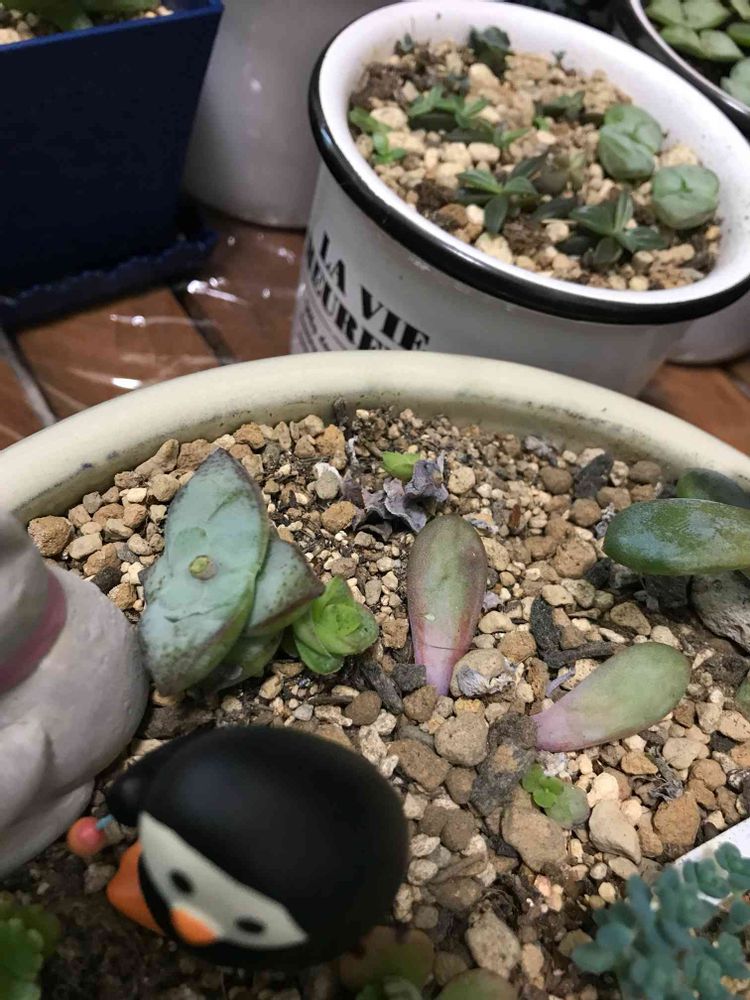 ペンギンとうさぎの裏にひっそり星の王子⭐︎他の物と陽当たりや水の量を調整する為に小物を置きました◡̈
