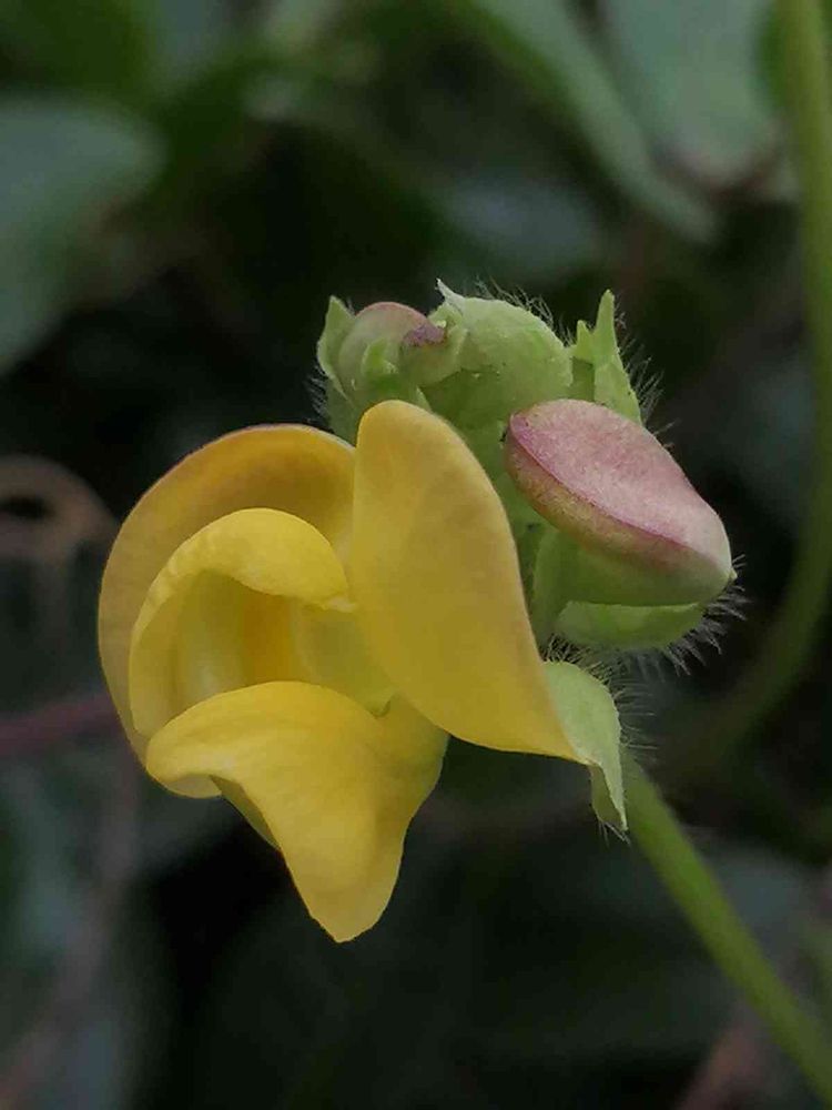 先のとがった葉が三枚ずつ出るつる植物で、 丸み のある黄色い花が咲きます。 花期は8月後半から 9月頃です。 小豆の原種と言われています。