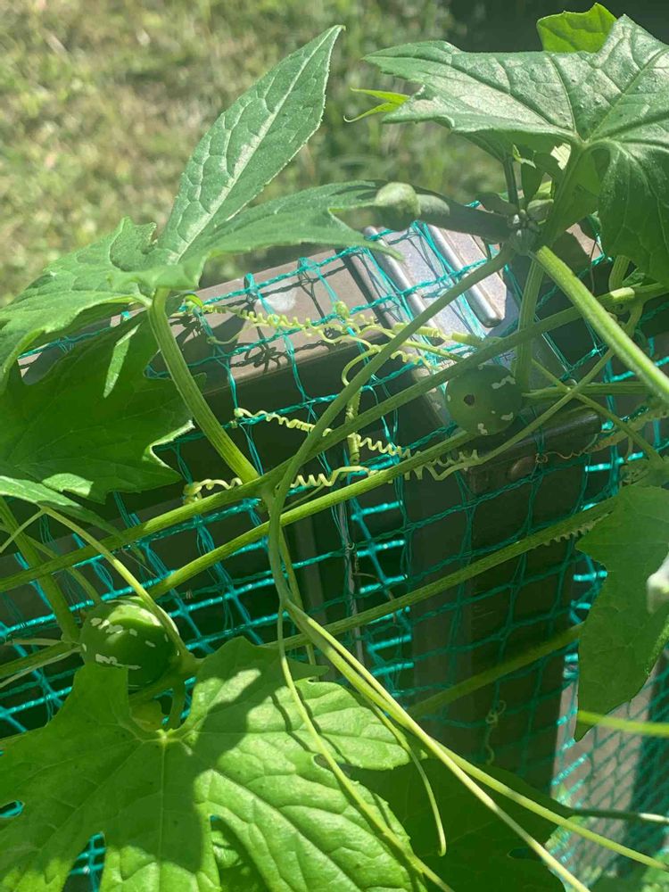 おはようございます。久しぶりのお天道様、感謝です。フェンス側のへちまの雌花もう直ぐ咲きそです。お隣にオキナワスズメウリの実も大きくなってきました。仲良く育ってくださいなぁ〜😍🥰😻😸🤗😊