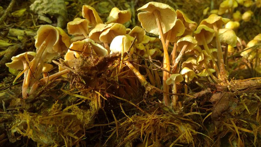 ここは登山道の一部で、樹林下。標高も1100m程度と比較的低いエリアでした。確かに落枝や落ち葉が降り積もった山の斜面に刻まれた小道。写真を撮るために林床を片手で軽く掘り起こしたのは事実です。右側のキノコはその枝から立ち上がっているように見えますね。でも、このコロニーの全体が落ちた枝から生えていたかと言うと、それは定かではありません。大きな枝なら、掘り起こすのに、エイヤッという感じでしょうから、せいぜい小枝だったもしれません。直径1センチほどのキノコかと思います。こうしてみると、カラマツの葉が、見えてるのですが、一体なんのキノコかなぁ。