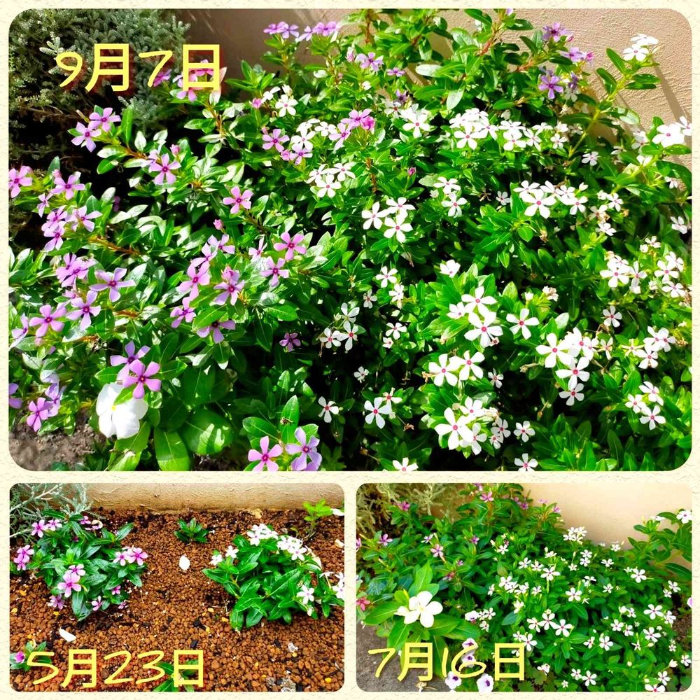 5月の植え付け時(左下)は、こんなにちいさかったのに、三ヶ月半経って花壇からはみ出るほどに成長しました☺