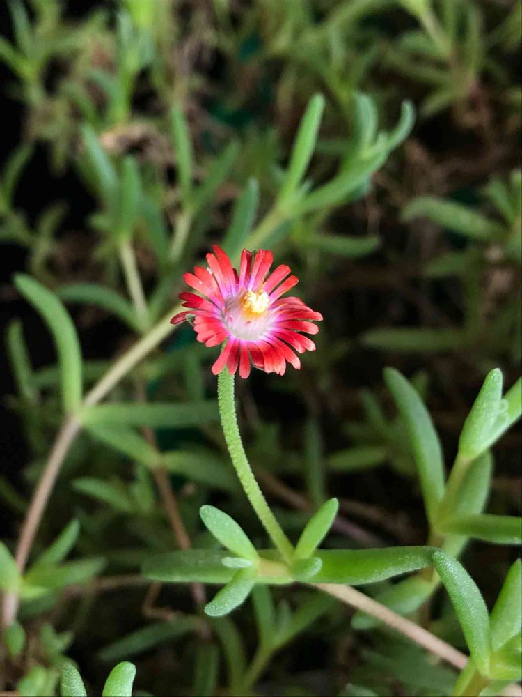 道端のマツバギクは真っ赤になって小さくなっているのに、室内のマツバギクは徒長しながらも花を咲かせていました。小さい花ですがきれいです✴︎