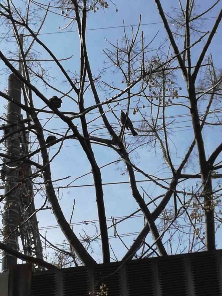 車が赤信号で止まったので、ふと外を見ると鳥が白い実を啄んでいました
