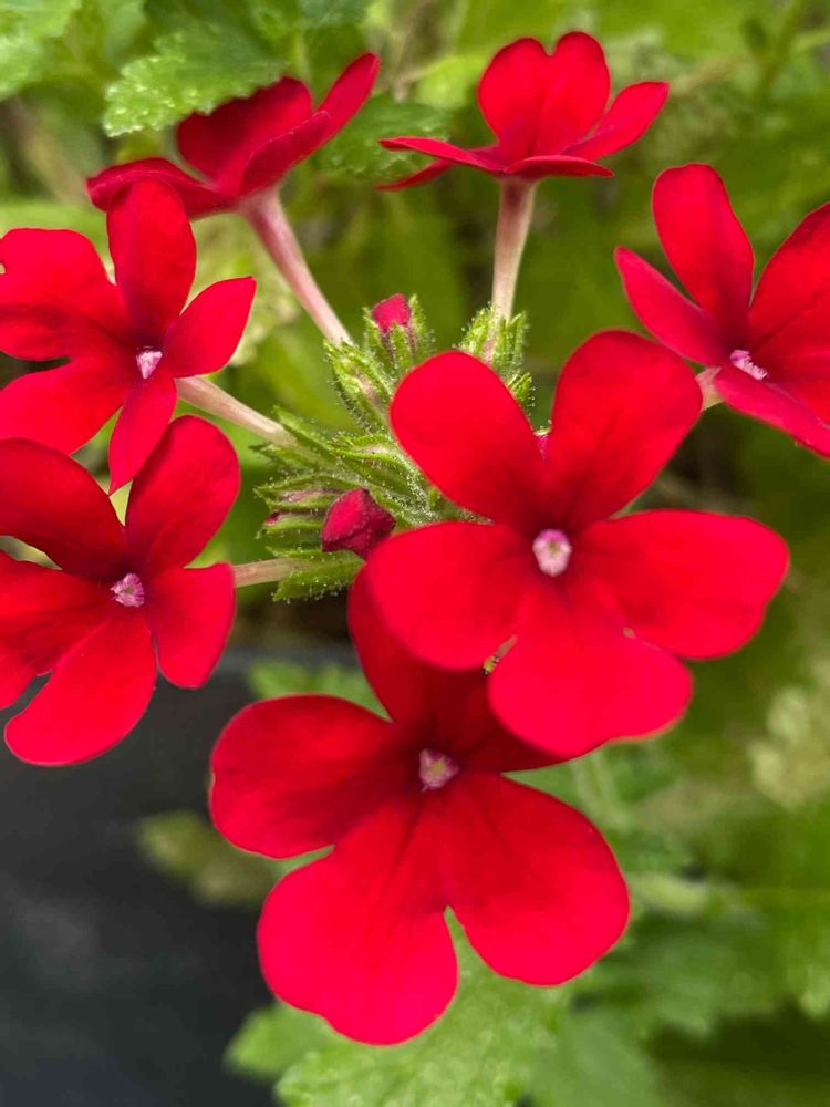 「バーベナ」赤が鮮やかで見入ってしまいます。雨で痛んでいたのが、復活です。