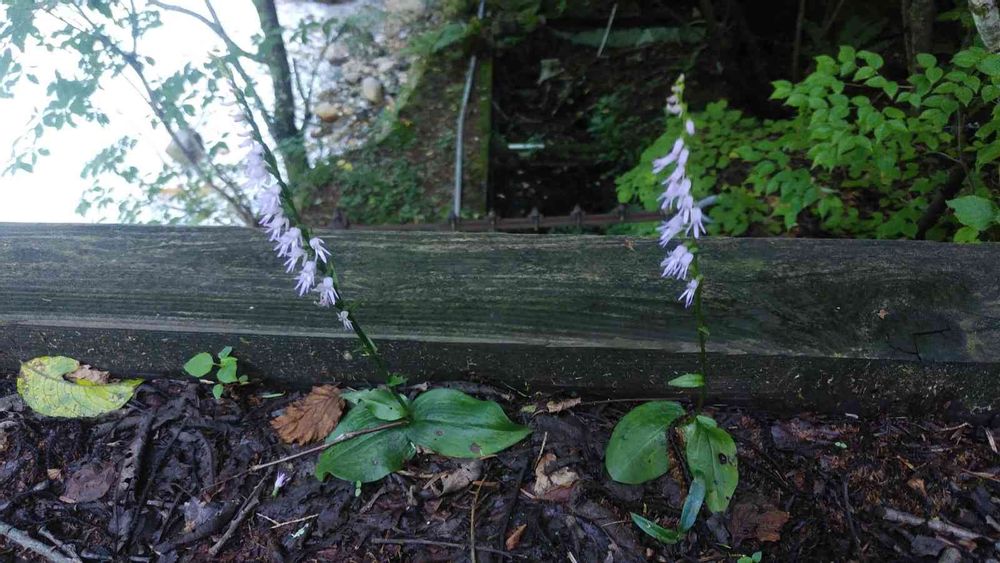 廃トンネルを潜ったその先に、一部足場板の腐った吊り橋があり、恐る恐る渡っていると、なんと足場板の上にミヤマモジズリが根を張っているのです。