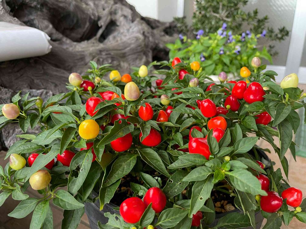 大きな流木の前に観賞用トウガラシが飾られてありました🌶🌿