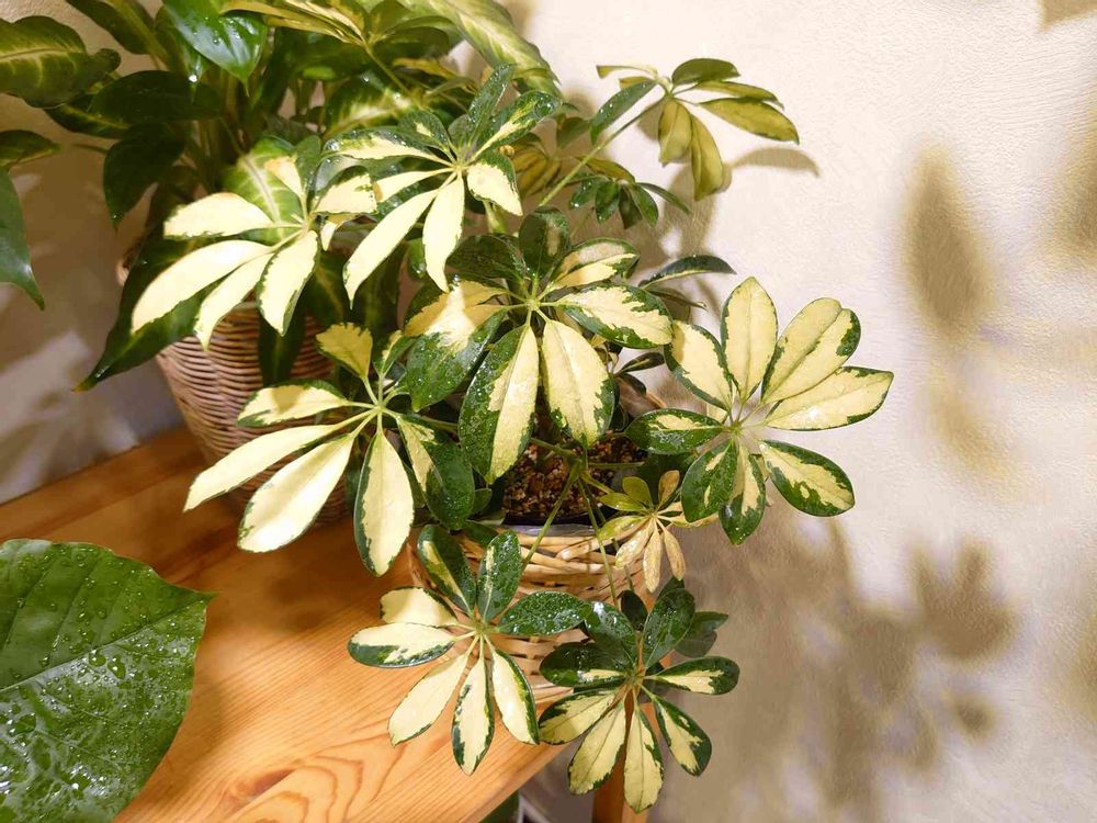 気まぐれで普通のシェフレラと寄せ植えし、屋外管理していましたが、葉焼が酷く、株分けし剪定したシェフレラ・ハッピーイエローです。