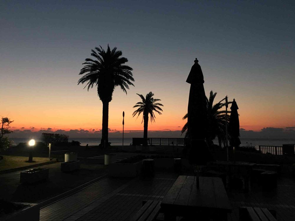 朝焼けですよ。この木の背後には朝焼けで染まった海がとっても綺麗です😊