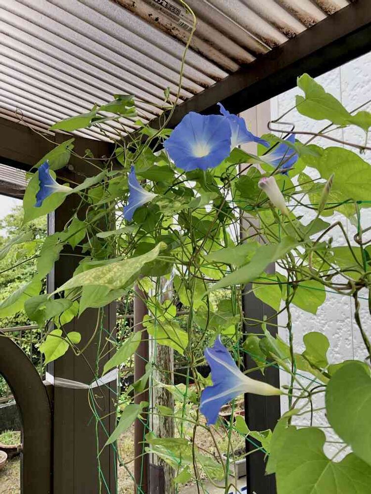 西洋朝顔のヘブンリーブルーが、今日は初めて六つも咲きました。