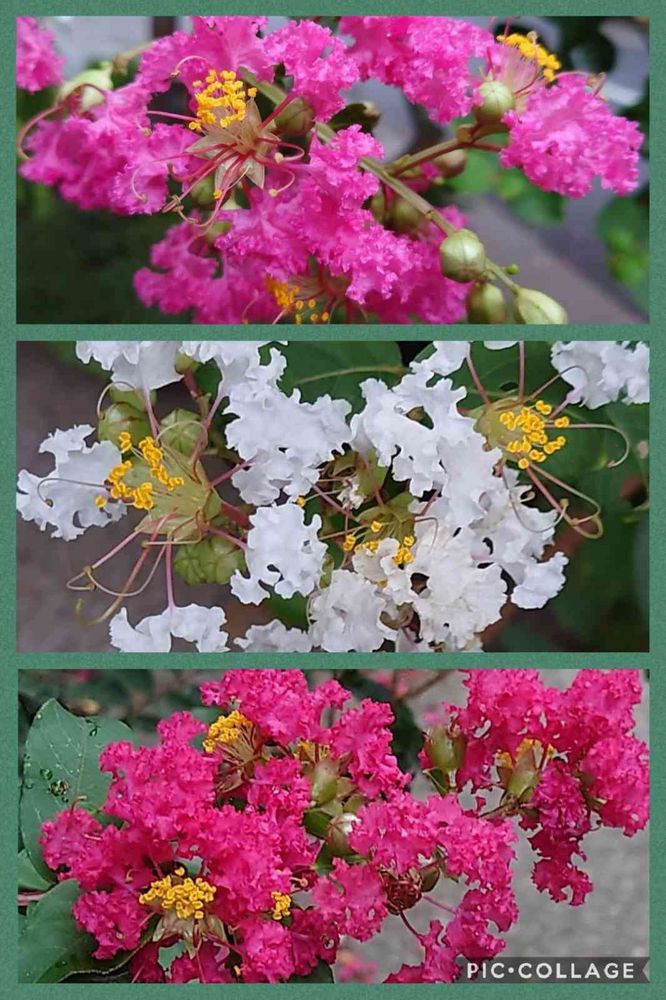 ピンク白、赤の街路樹のサルスベリの花、沢山〜咲いて綺麗です💕