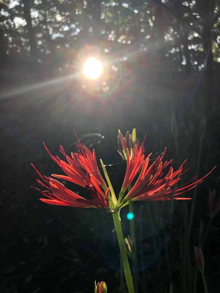 彼岸花が朝日に輝き、逆光に彼岸花が浮き上がる、一瞬の素晴らしい光景に感動してしまいました。