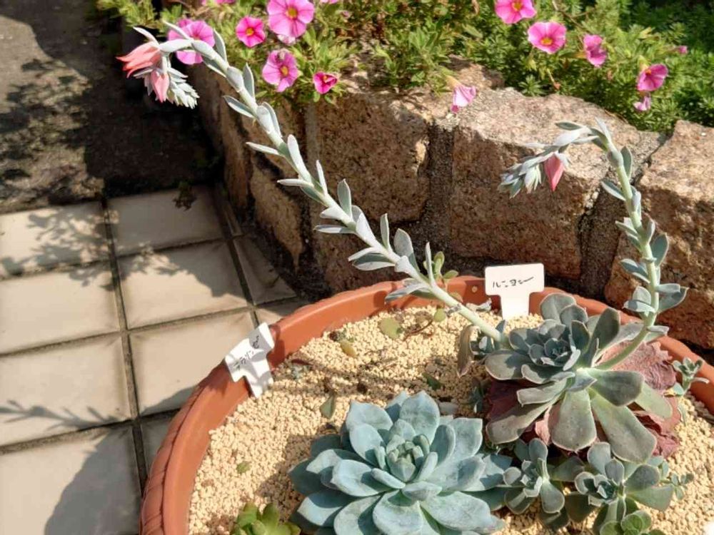 ルンヨニーに花芽がついてピンクのかわいい花が咲き始めました😊