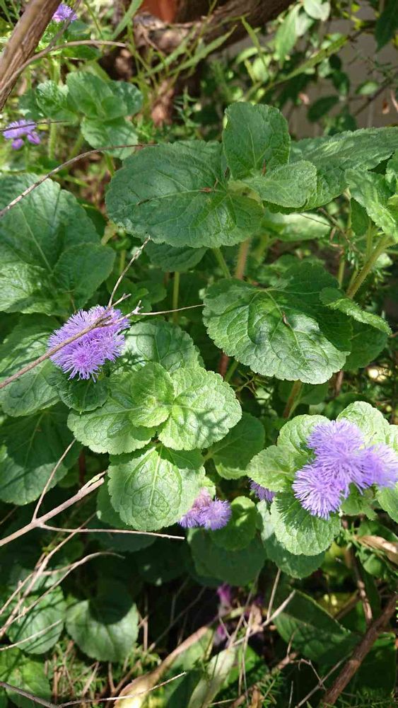 花壇の隅に紫の小さなボンボリみたいなアゲラタム。