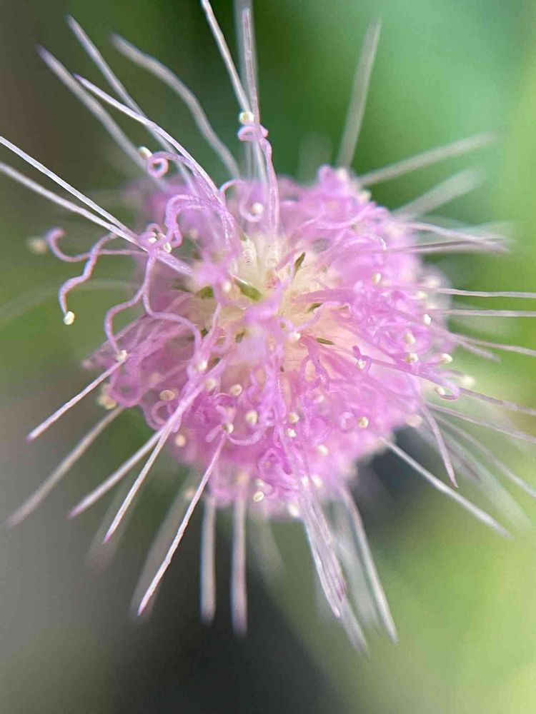 オジギソウの花は、一日しかもたないと聞いていたので、夕方見ると萎み始めてた