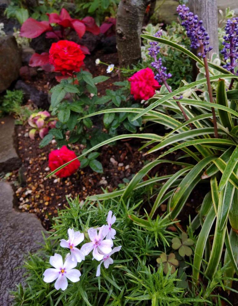 可愛い薔薇の復活🎵嬉しいね😃コリウスの赤とヤブランの紫と合わせて大人色✨
