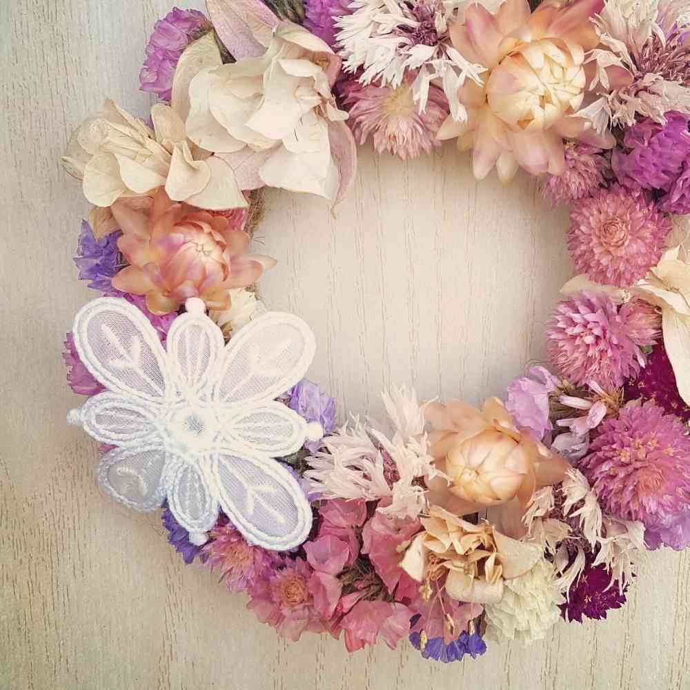 千日紅、貝細工、矢車草、フクシア、スターチスをつかった、ピンクの春らしいリース。