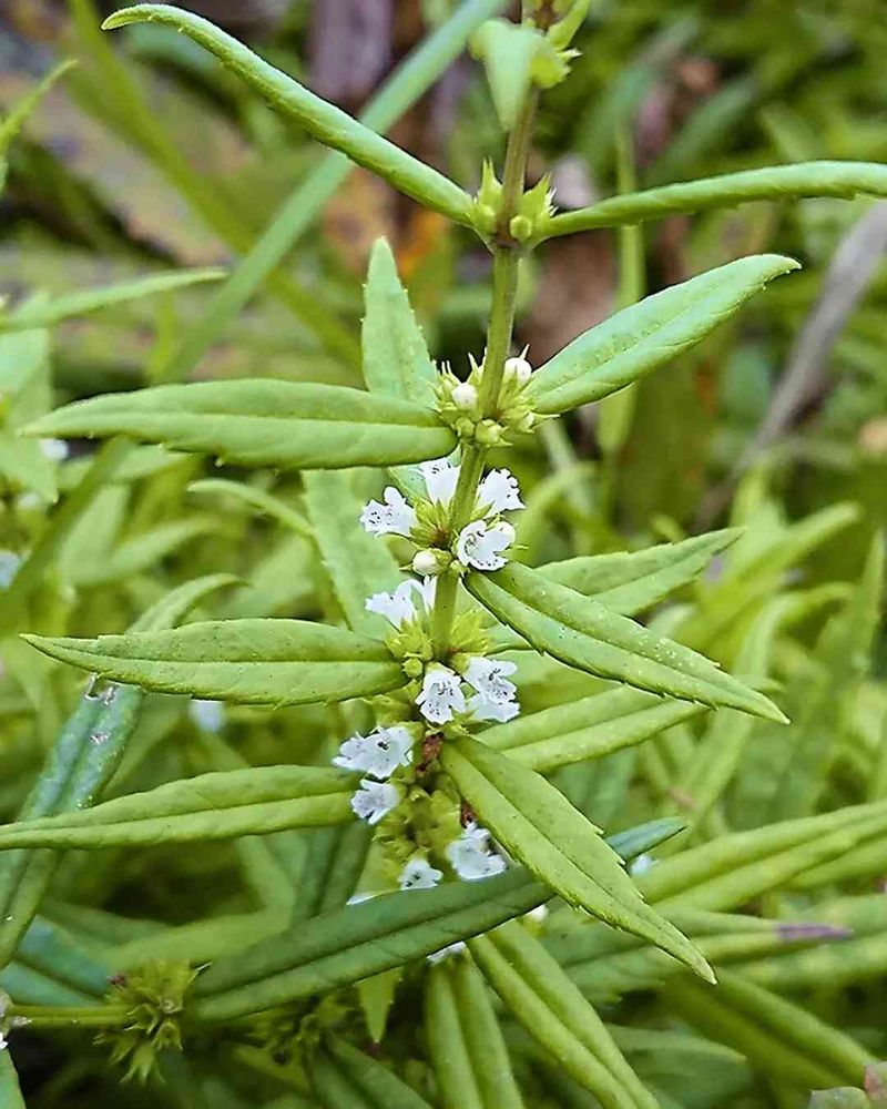 シソ科シロネ属の多年草。山野の湿地に生える。高さ30~70㎝。白根(シロネ)に似ているが、葉は細く長さ4~8㎝、幅0.5~1.5㎝の披針形。葉には光沢があって細長く、縁の鋸歯が鋭いのが特徴。茎は四角で細く無毛。花期は8~10月。葉腋に白色で直径約5㎜の唇形花がかたまってつく。下唇に赤い模様がある。萼裂片が刺状になる。