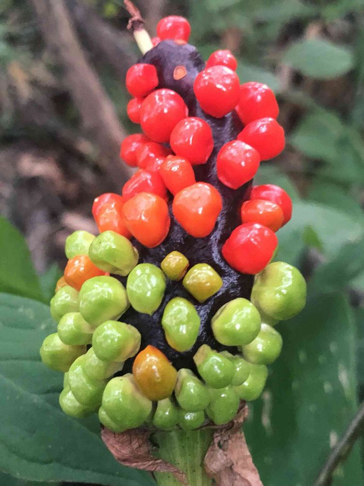 マムシグサがマーブルチョコレートみたいに見えて、赤い実を一粒食べたせいか😋今朝から