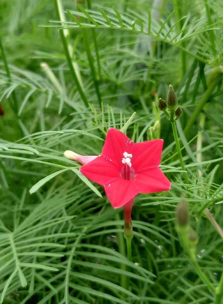 もりもりの細い葉の間から 蕾が多い中 綺麗に咲いていました☺️