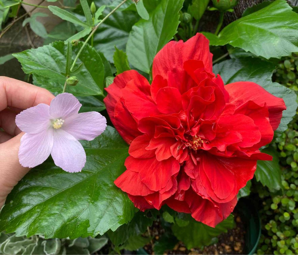八重咲きハイビスカスメデューサとハイビスカス ロバツスのツーショット📸