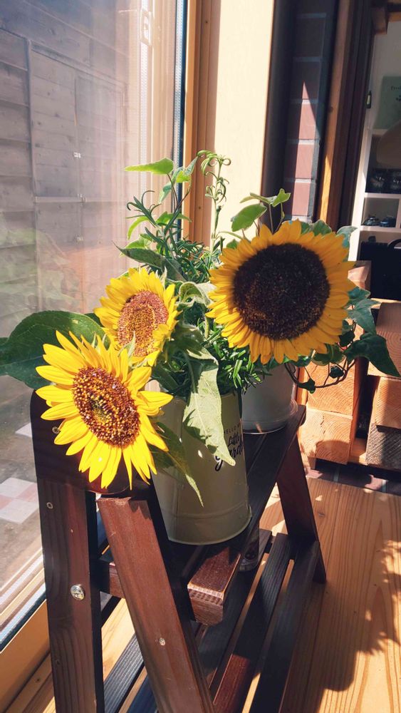 マリーゴールドの隣で晩夏の太陽を受けて最後の向日葵が3本咲いていたので、飾りました🎵