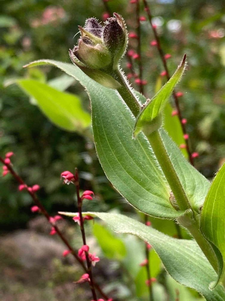 ホトトギス もう暫く開花には至らなそうです。ミズヒキと仲良く揺れています。