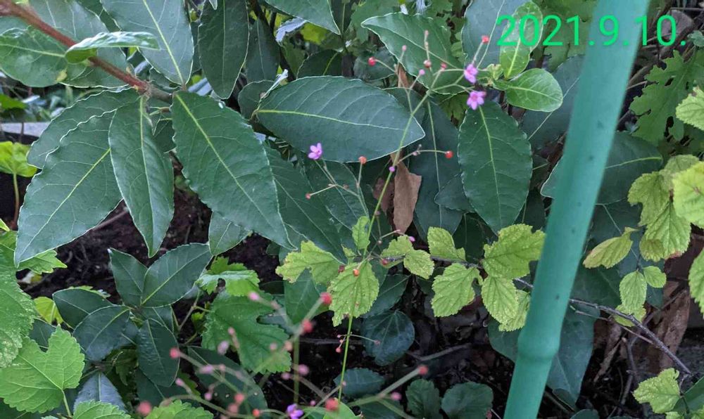 月桂樹の葉と一緒に写っています花に「三時草」ピンク色の花があります。